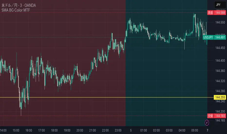 For example, if you set the SMA Length to 200 and the MT Timeframe to 5 minutes, the indicator will display a red background on the 1-minute chart when the price drops below the 200 SMA on the 5-minute chart. This helps you quickly recognize that the trend on the higher timeframe has turned bearish—without having to open a separate chart.