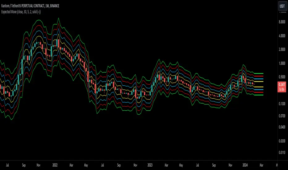 This indicator gets the Expected Move for 1-4 Standard Deviation Ranges using Historical Volatility. Then it displays it on price as bands.