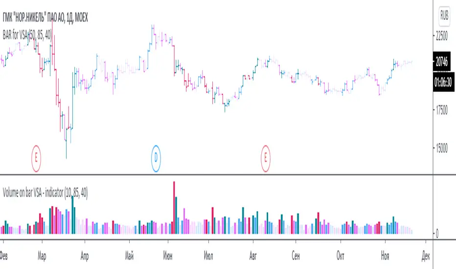 Bars are colored according to the indicator Volume on bar VSA - indicator V2