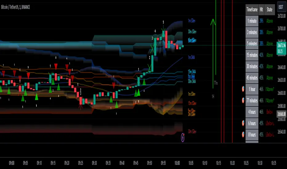 Backtest Table (Location & Size): if on, shows a timeframe screener table. Use “Small” as a Size for better mobile screen displays. This table allows you to see active targets and their directions across every timeframe. The table also displays the weighted average (%) of Hit targets signals, from the chart's timeframe point of view to all other timeframes.