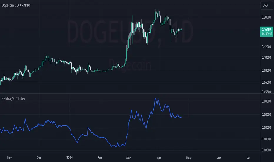 This custom TradingView indicator, titled "Price Relative to BTC Index", allows users to visualize the price of any selected asset relative to Bitcoin. It achieves this by comparing the closing price of the current ticker to the closing price of Bitcoin as measured by a prominent BTC index. The resulting relative price is then plotted on the chart, providing a clear and direct visual representation of how the asset is performing in comparison to Bitcoin. The plot is displayed in blue with a line width of 2, ensuring that it stands out on your trading charts. This indicator is especially useful for traders looking to assess market sentiment and relative strength between Bitcoin and other assets in real-time.