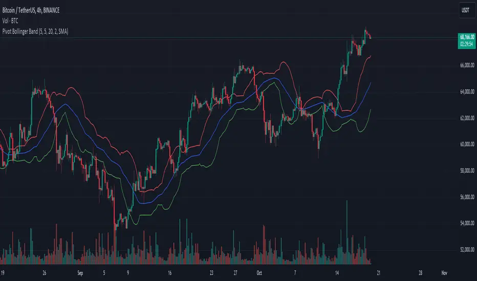 This is a special kind of Bollinger Bands indicator that adapts to the market's pivot points. Instead of using regular price data, it first finds important swing highs and lows in the market (called pivot points). It then uses these pivot points to create a center line, which is like a moving average of where the market is pivoting.