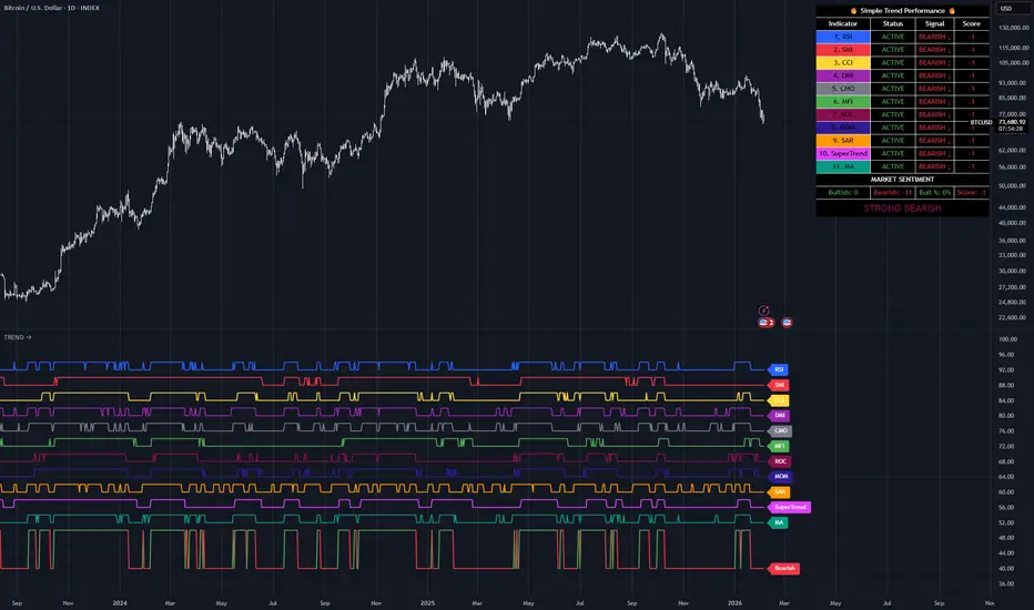 Simple Trend Performance is a comprehensive multi-indicator analysis tool that combines 11 popular technical indicators into a unified trend scoring system. This indicator provides traders with a clear visual representation of market sentiment through an easy-to-read scoring panel and graphical display.