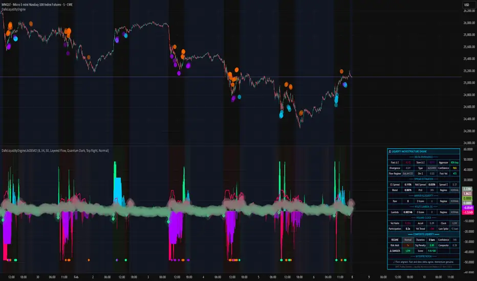 The DafeLiquidityEngine was created to answer these critical questions. This library is not a simple "mashup" of existing indicators; it is a foundational, original work that brings a suite of concepts from academic and institutional quantitative finance directly into the Pine Script environment. Its purpose is to move beyond the one-dimensional view of volume and provide a multi-faceted, high-resolution picture of the market's true, underlying liquidity structure.