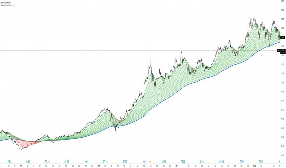 This script starts with the 252 E(S)MA and steps it down 21 days per MA. The starting ribbon (Annual Moving Avg Length) and step-downs (Monthly Step Downs) are adjustable.