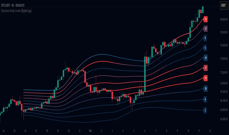 Dynamic Heat Levels [BigBeluga] is a powerful tool for traders looking to analyze price interaction zones with a heatmap effect. It offers a structured visualization of market dynamics, allowing traders to gauge the significance of key levels and detect mean reversion setups effectively.