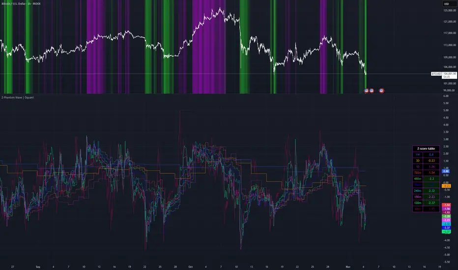 Interactive Table Display: A compact table on the chart shows timeframe labels, corresponding Z-score values, and color-coded backgrounds for quick identification of overbought (purple) or oversold (green) zones.