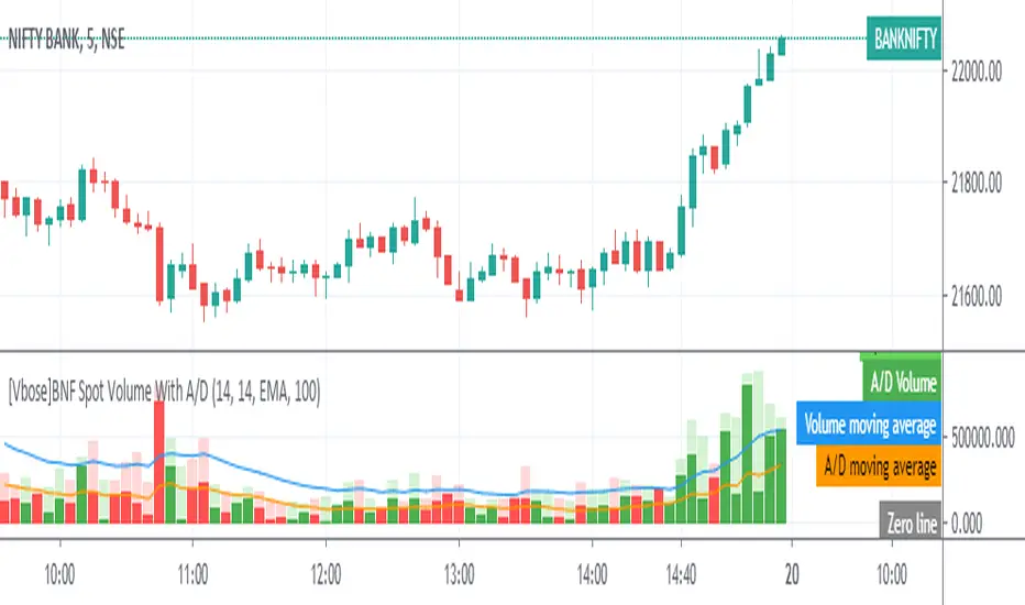 Bank Nifty Volume With Accumulation/Distribution Indicator shows Weighted Spot volume bars and the accumulated/distributed (A/D) portion of them. It calculates candle body to candle height ratio and multiplies it by Spot volume: Spot volume*(close-open)/(high-low)