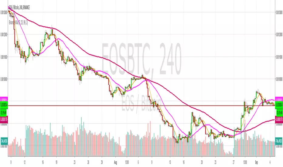 Pretty simple, just the three moving averages that Binance traders see by default (7MA, 25AM & 99MA) and they use the same default colours.