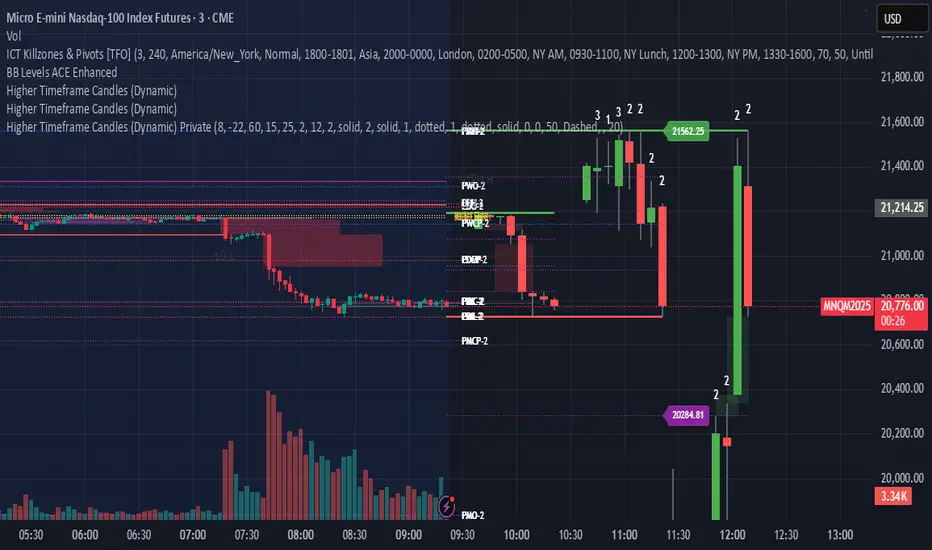 Displays up to 5 candles from a user-selected higher timeframe (e.g., 15-minute, hourly).
