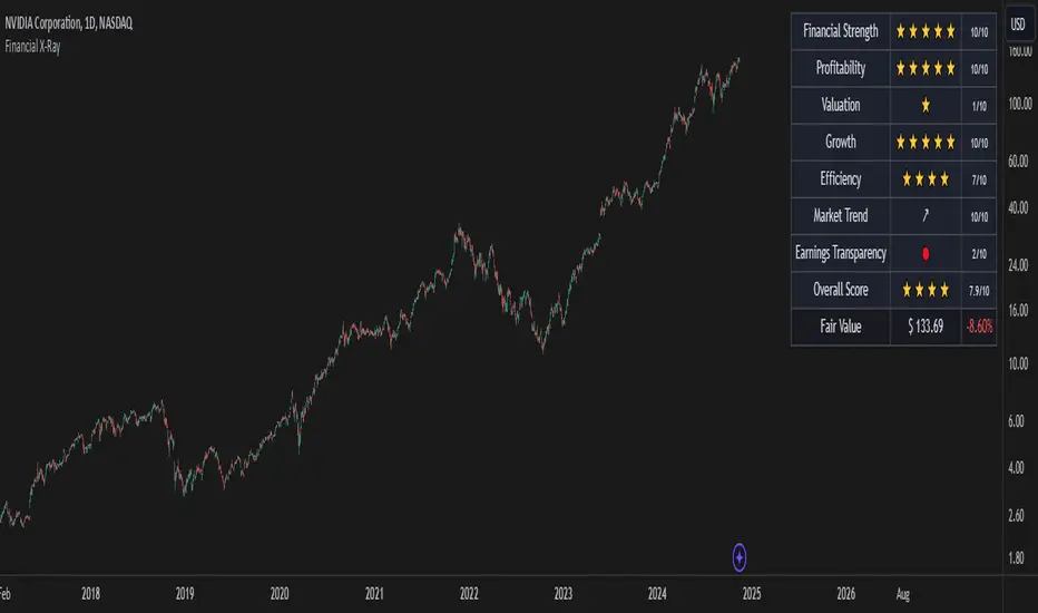 This Financial X-Ray indicator is provided for informational and educational purposes only. It should not be considered as financial advice or a recommendation to buy or sell any security. The data and calculations used in this indicator may not be accurate or up-to-date. Users should always conduct their own research and consult with a qualified financial advisor before making any investment decisions. The creator of this indicator is not responsible for any losses or damages resulting from its use.