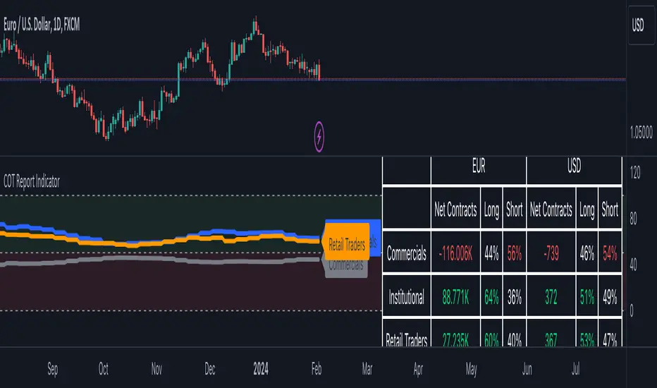 A COT Report Indicator that shows the Data for both currencies (base- and quotecurrency). It works in the forex market and on the Bitcoin Chart.
