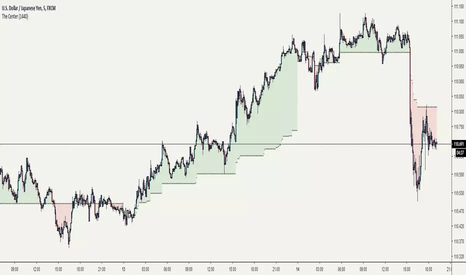 This line off Adams blog inspired me to cook up a very simple indicator that just takes the High and Low of the time given (input in minutes), adds them together and divides it in half. This way we get a center based on the higher timeframe. Not only does it inform you of the dominating trend, but also works as a sort of momentum indicator if you measure the distance price is from the center.