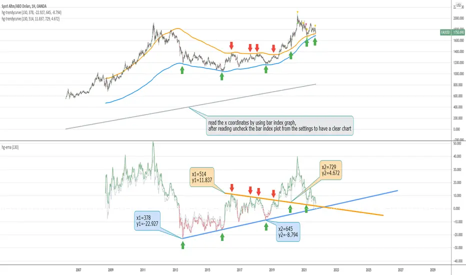 First of all, we start by determining the coordinates from the trendlines drawn in hg. The coordinate of trendline beginings is x1,y1. In the continuation of the trendline, the coordinate of the second point taken from anywhere on the trendline is defined as x2,y2. In order to find the x1 and x2 values, the gray bar index chart must be open. After reading the values, the bar index chart can be turned off in the settings. The x coordinates of the trendlines will be the values in this gray bar index graph. You can read these coordinates from the gray numbers in the hg-trendycurve setting at the top left of the graph. The y values are the y axis values in the hg indicator.