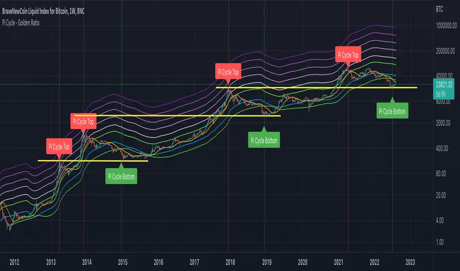 Based on the article this indicator has been created to display and indicate the Bitcoin PI Cycle Top which has historically been effective in picking out the market cycle highs within 3 days. It also displays the Golden Ratio Multiplier which explores Bitcoin's adoption curve and market cycles.