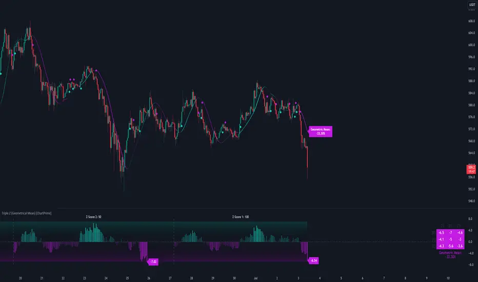 The "Triple Z (Geometrical Mean) [ChartPrime]" indicator calculates three Z-scores of closing prices with different lengths, computes their geometric mean, and visualizes it on the chart with gradient colors and labeled values. Signals are generated when the geometric mean crosses above or below zero.