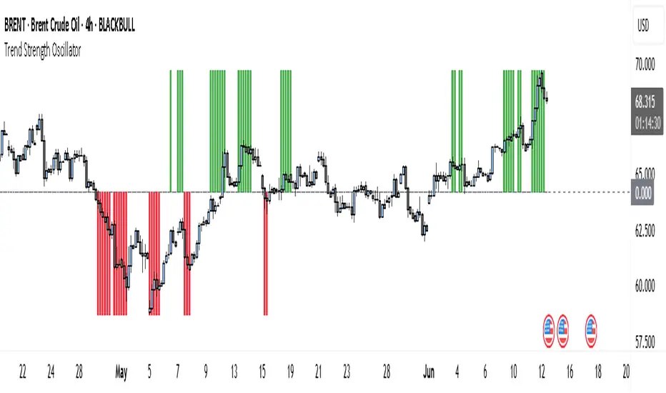 The Trend Strength Oscillator is a visual tool that helps traders understand the overall direction and strength of the market trend. Instead of using multiple indicators separately, this tool combines three trusted methods into one clear, color-coded bar chart. The bars change based on whether the market is strongly trending up, down, or just moving sideways.