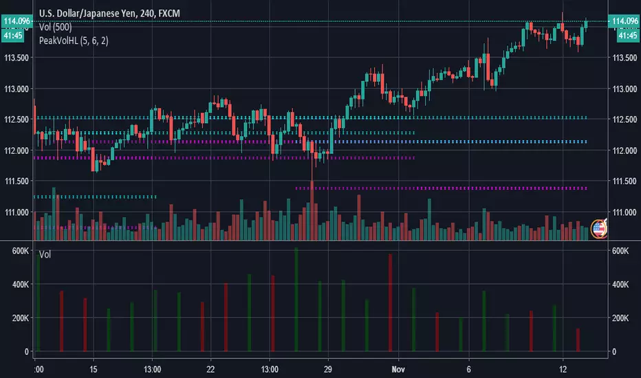 This indicator will plot the high/low price of highest intraday volume of highest day volume.
