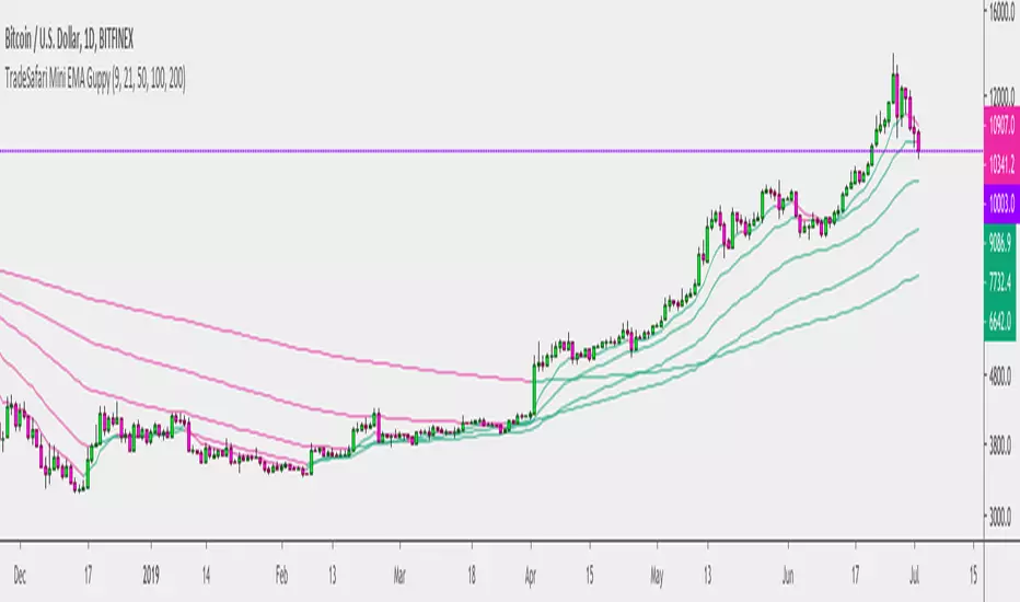 This is a 5 EMA Ribbon, created to be a simplified version of the Super Guppy, which was used as a starting point.