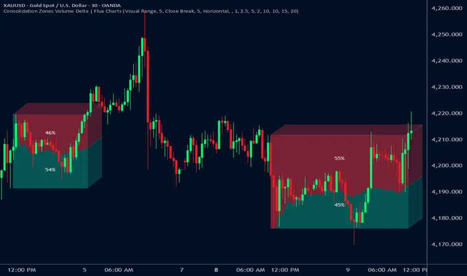 The Consolidation Zones Volume Delta | Flux Charts indicator is designed to identify and visualize consolidation zones on the chart. Rather than only outlining areas of sideways price movement, the indicator analyzes volume activity occurring inside each consolidation zone. This is done by aggregating lower-timeframe volume data into the higher-timeframe consolidation range, allowing users to see how buying and selling activity evolves while price remains in a range.