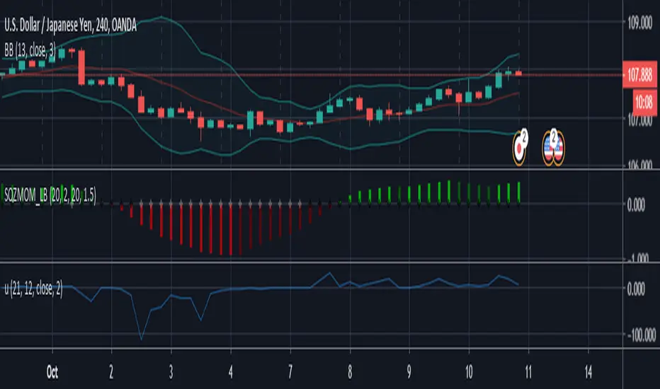 Expanded Description:Here is how it works: I apply Bollinger Bands to the price of an instrument. Then, the price is undergoing sinusoidal movements relative to the price channel, thus can be modeled by simple harmonic motion formulas. Next, solve the sine equation for angular frequency, then use it to calculate energy, with volume as mass.