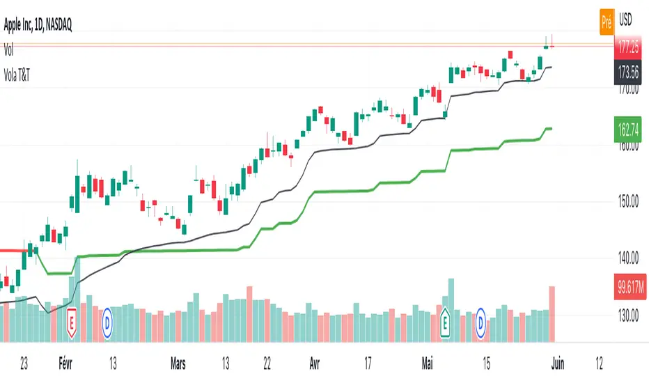 If you already chose to have access to Vola2vola volatility indicator, this one is using the same formula but instead of having a separate indicator to display Volatility, Volatility has now been converted into price values, which makes it possible to visualise it on the ticker chart directly.