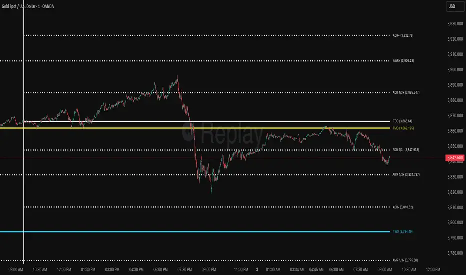 This advanced technical analysis tool calculates and displays Average Daily Range (ADR), Average Weekly Range (AWR), and Average Monthly Range (AMR) levels. The indicator incorporates smart detection technology that automatically maintains monthly level visibility when historical data becomes unavailable.