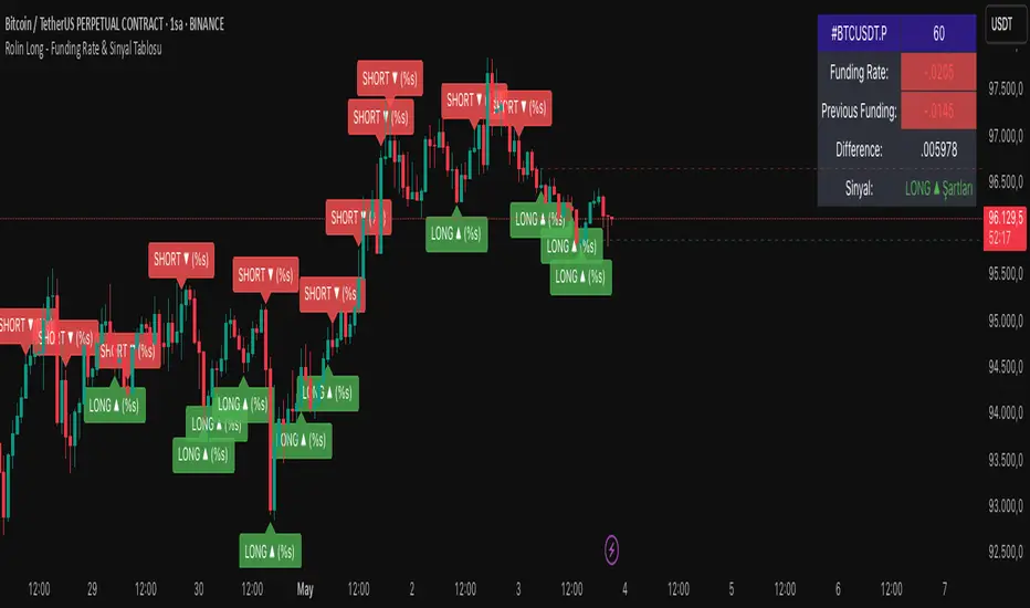Funding Rate Signal Table computes a rolling “funding rate” value (simulated here as (close–open)/close), smooths it, and presents both a compact on-chart table and clear LONG/SHORT entry signals. It helps you spot when funding dynamics may favor long or short positions and visualizes the last signal’s price level.