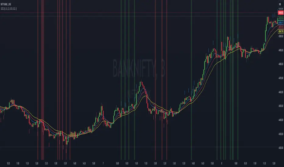 The indicator will give bullish triggers only when the price touches 13EMA or 21EMA, the closing price is greater than 13EMA and the difference between 13EMA and 21EMA is greater than 0.02% or 10 points.
