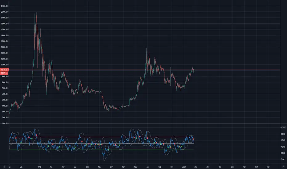 BBands show the standard deviation of the RSI, and can therefore suggest if a trend is oversold or overbought in conjunction with the 30 and 70 RSI values. A tightening of the BBands also suggests a major move/trend change is immanent.
