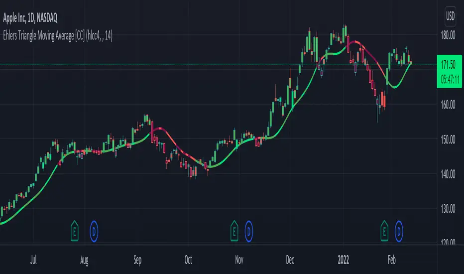 The Triangle Moving Average is the last of custom scripts converting Ehlers Window Indicators to Moving Averages. As you can see this is actually very similar to the Hamming Moving Average and the Hann Moving Average so I would recommend to test this one out with different settings and see what works best for you. As far as the formula calculation, it is a custom weighted moving average that determines how close the price is compared to the middle of the length period and gives a custom weight to that price. For example it will assign heavier weights according to how close the price is to the beginning of the loop (which is the most recent data) and lighter weights, the further the price is away from the recent prices. I have included strong buy and sell signals in addition to normal ones so strong signals are darker in color and normal signals are lighter in color. Buy when the line turns green and sell when it turns red.