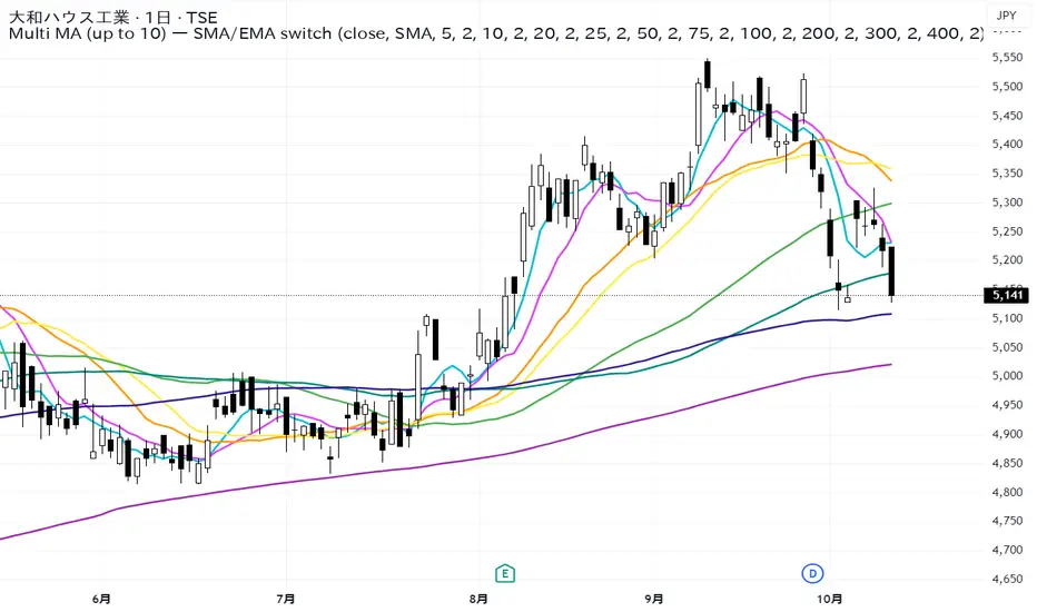 1つのインジケーターで10本の移動平均線まで表示できるインジケーターです。大量に使う人向けです。SMAとEMAの切り替えもできます。