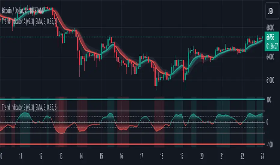 - The "Trend Indicator B-V2" uses the same values in a different way to measure the momentum of the trend and identify potential trend rejections.