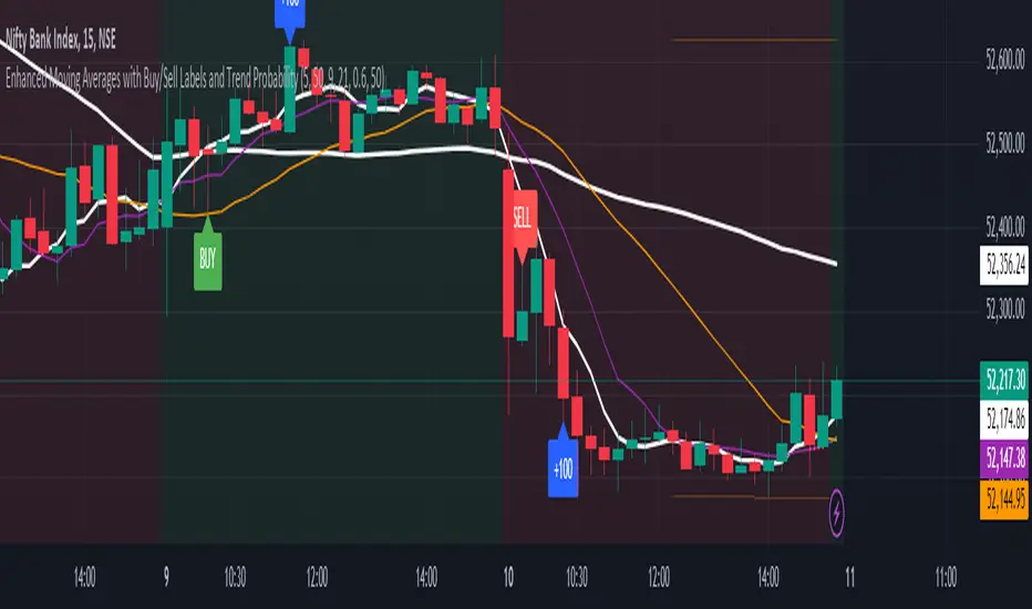 This Pine Script code is for an advanced trading indicator that displays enhanced moving averages with buy and sell labels, trend probability, and support/resistance levels. Here’s a detailed description of its components and functionality: