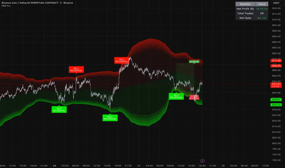 FBB Buy/Sell Pro is a volatility based reversal tool that builds a dynamic channel around a volume weighted moving average and highlights potential turning points at the extremes. The indicator paints a smooth "funnel" of bands around price and generates Buy/Sell labels when candles reject the outer zones, helping you spot exhaustion and mean reversion opportunities in trending or ranging markets.