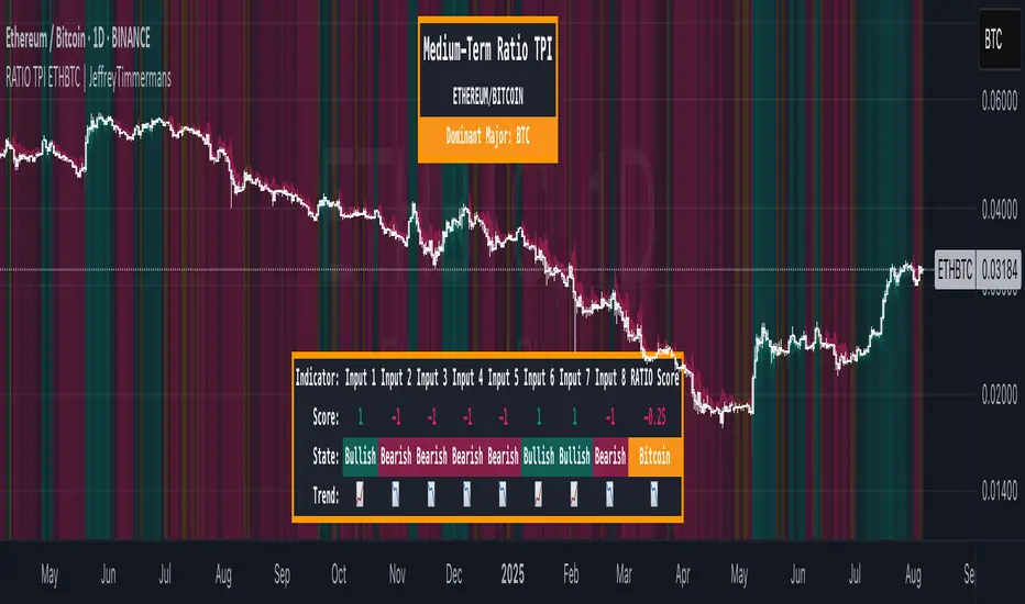 Medium-Term Trend Assessment | Dominant Major Detector: The ETHBTC Ratio TPI is a medium-term trend-following indicator designed to measure the relative strength between Ethereum and Bitcoin — the two most dominant assets in crypto. By analyzing the ETHBTC ratio, this tool provides insights into which of the two is currently leading the market trend.