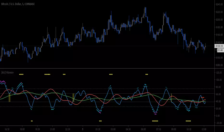 Plus version of Waves with components from both Waves Advanced and Mnemosyne. Essentially, Waves+ is highly configurable hybrid wavetrend oscillator and Fibonacci oscillator.