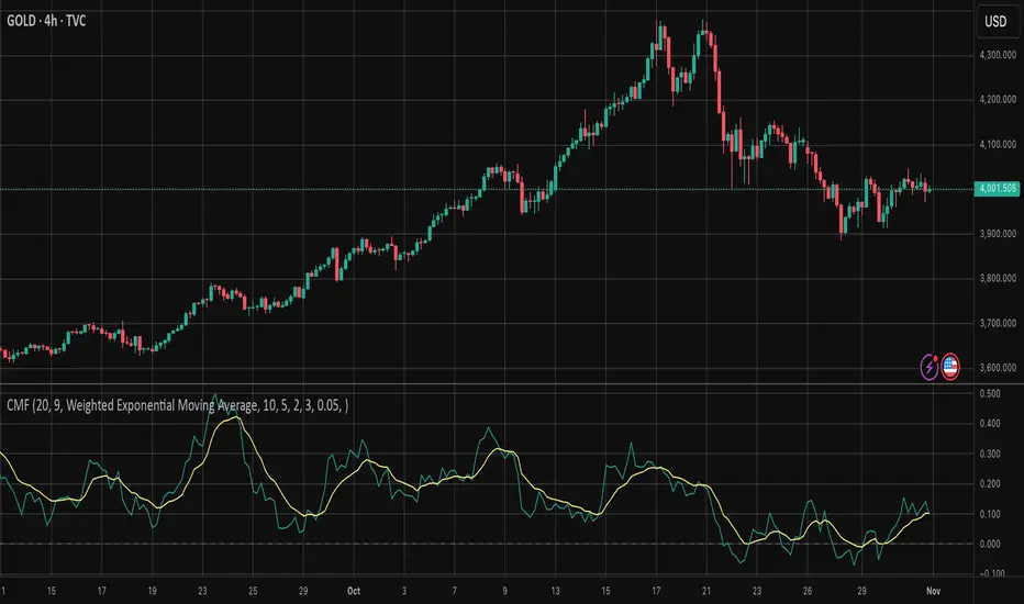 Customizable Signal Line: Includes an optional moving average of the CMF, which serves as a signal line. The type of MA (Signal Smoothing) and its length can be customized. This signal line can also be optionally volume-weighted (Volume weighted).
