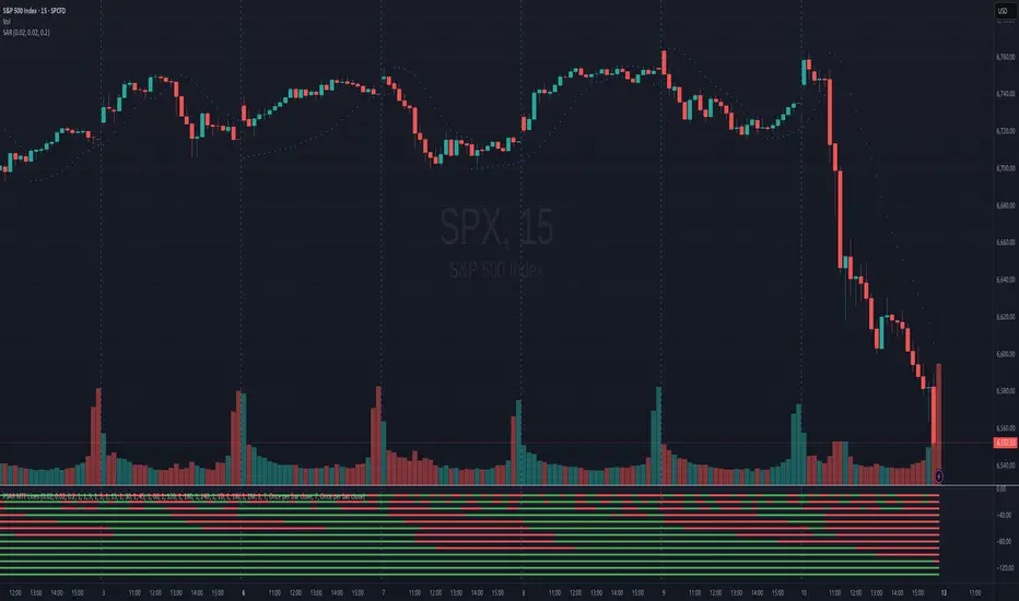 The indicator shows the Parabolic SAR sign (price above or below the indicator) for several timeframes at once. You can see at a glance how the price is trending across higher and lower timeframes.