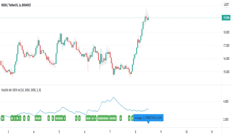 It shows the volatility (mobility) of a cryptocurrency. Comparisons can be made between cryptocurrencies in terms of mobility. Atr period can be entered. Atr volatility can be entered. Thus, if the volatility in a bar is higher than the entered volatility, the indicator b sign goes down. The more b signs there are, the more volatile it is. Average Atr period can be entered.
