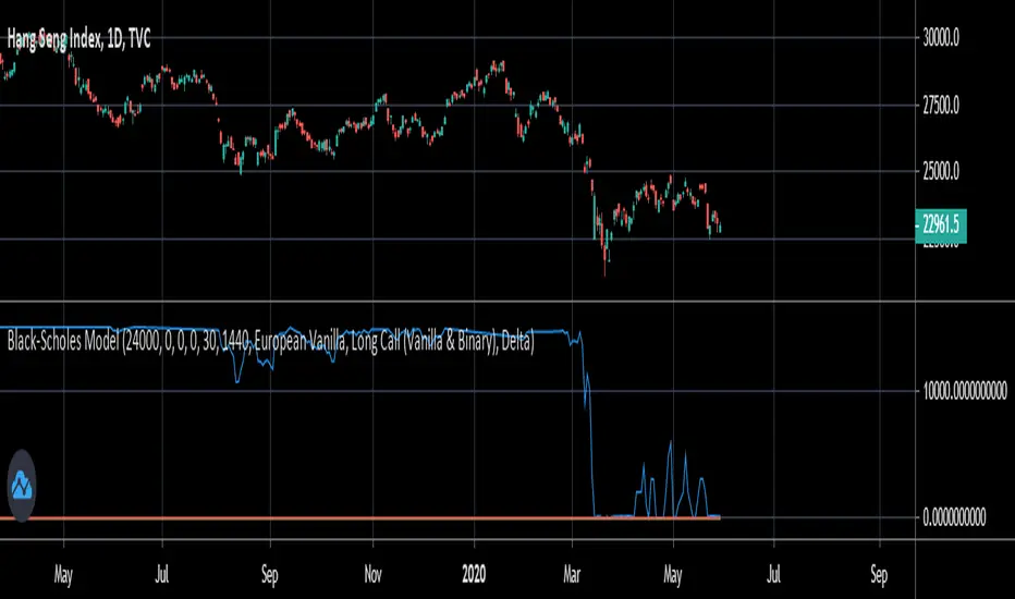 The Black-Scholes model is a mathematical model used for pricing options. From this model you can derive the theoretical fair value of a European option (an option where you have to wait until expiry to exercise). Additionally, you can derive various risk parameters called Greeks. This indicator includes three types of data: Theoretical Option Price (blue), the Greeks (green), and implied volatility (red); their values are presented in that order.