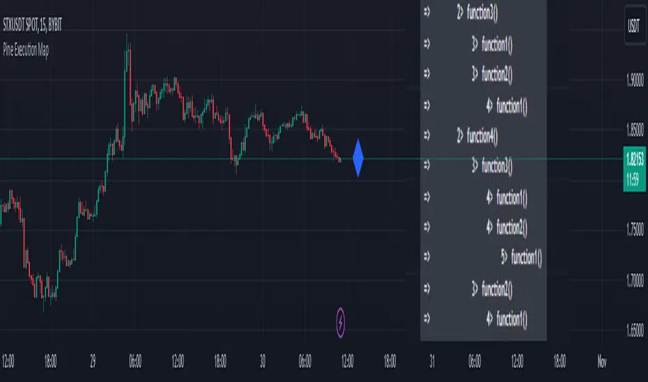 This is an educational script for Pine Script developers. The script includes data structure, functions/methods, and process to capture and print Pine Script execution map of functions called while pine script execution.