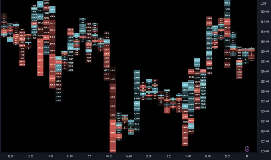 - Volume delta boxes can be merged and delta values removed to generate a color-only canvas reflecting vol. delta differences in price blocks.