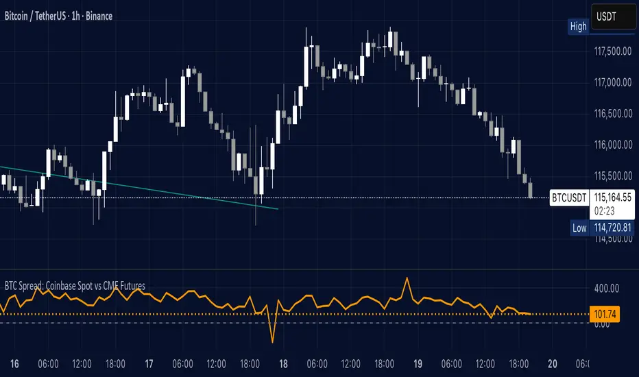 This indicator plots the real-time spread between Coinbase Spot BTC (COINBASE:BTCUSD) and CME Bitcoin Futures (CME:BTC1!).