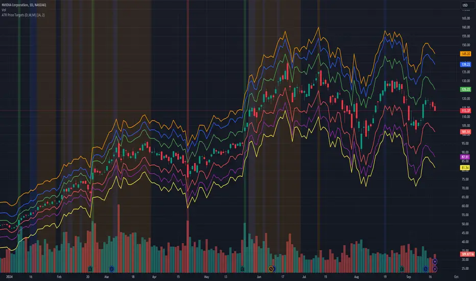 - Daily, Weekly, and Monthly ATR Targets: Automatically calculates and plots upper and lower price targets based on ATR values for each timeframe.