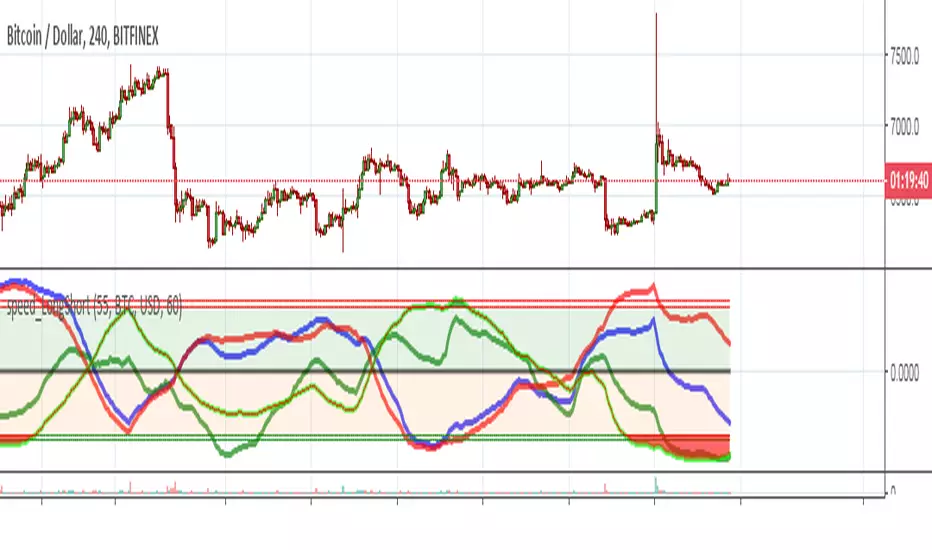Indicator of the position growth rate in long and short. Schedule of positions long and short is taken from the stock exchange Bitfinex. The total number of long and short positions shows the total activity of traders and indirectly the total volume of transactions. On the chart of the indicator it is a blue line.