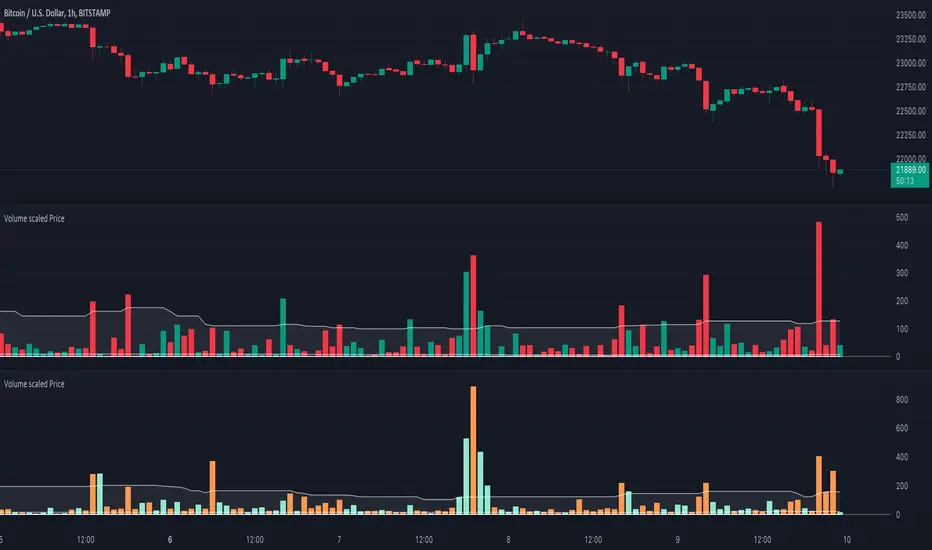 🔹 This script shows price in a similar style as volume. To accomplish this we use the body of the candle (close-open), which is placed on a zero line.