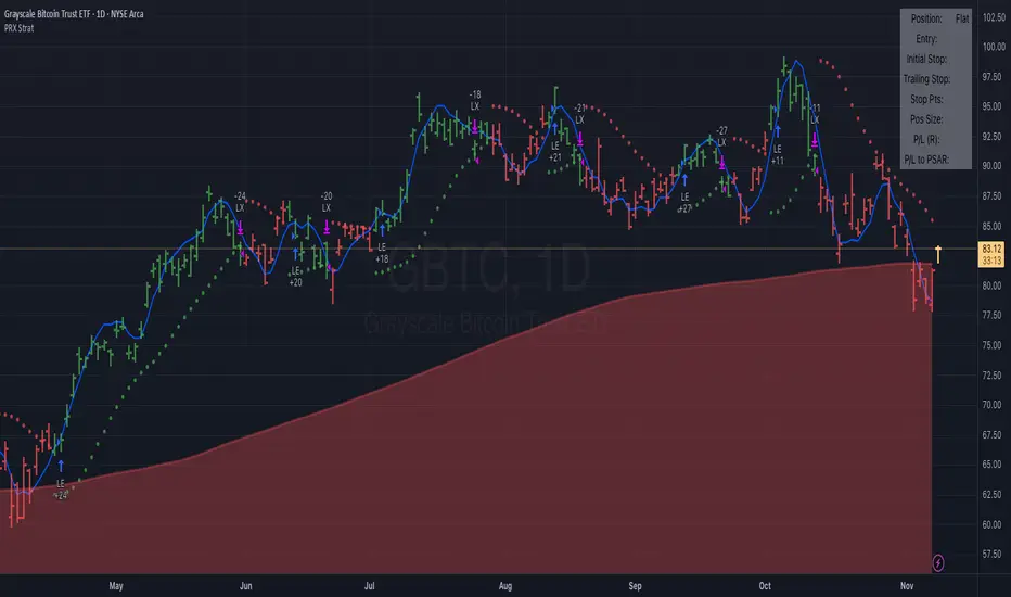 The intent is to help identify and stick with trends longer, adapt to changes in volatility by using linear regression as a noise filter and potentially capture large outlier moves. A linear regression curve is plotted as well in order to help identify when a change in trend will occur by it crossing the PSAR dots.