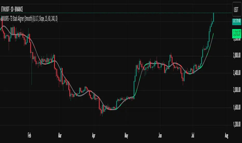 The JXMJXRS - T3 Stack Aligner is a multi-timeframe trend confirmation tool that uses a smoothed moving average known as the T3. The T3 is built using six layers of exponential moving averages to reduce noise and lag while maintaining a smoother appearance than traditional moving averages. This indicator helps identify when multiple timeframes are aligned in the same direction, giving greater clarity on whether a trend is strong and consistent.
