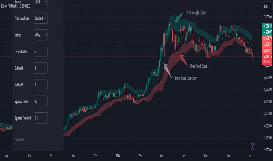 It's the same logic behind standard BB but instead of using length(period), I created a formula and used a "factor" to scale it up/down.